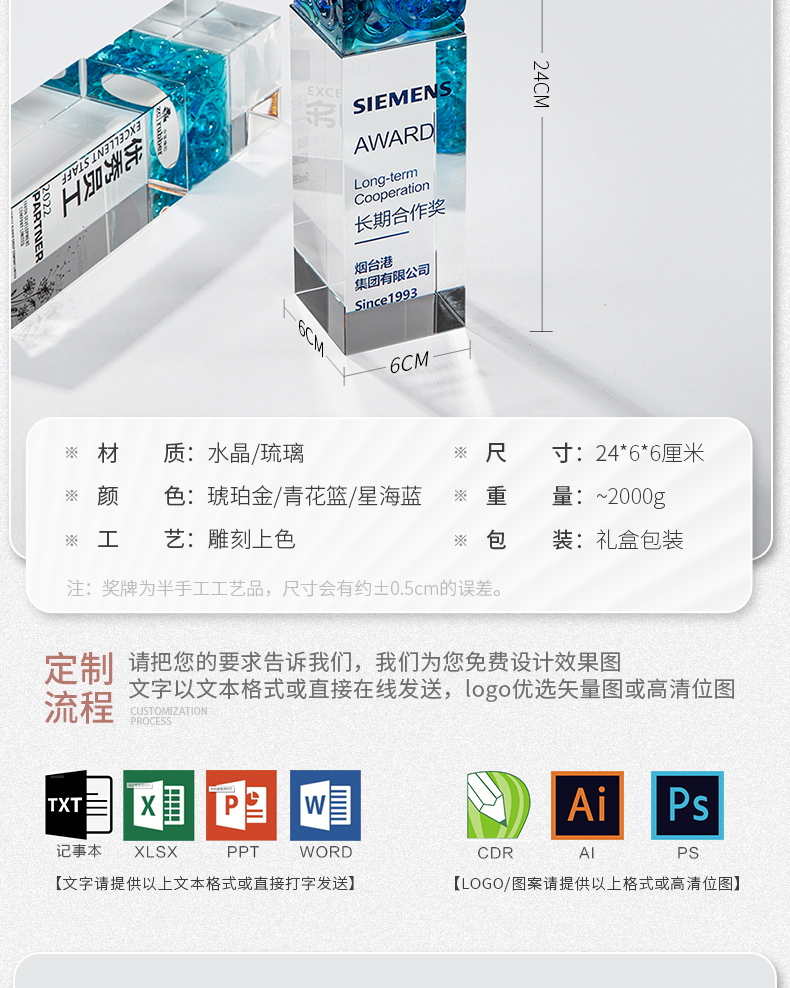 1030 / 高档琉璃水晶奖杯定制定做企业颁奖公司年会优秀员工冠军奖牌订制