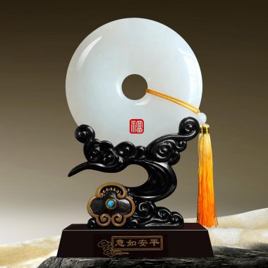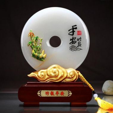 83 / 成都天然玉石平安扣珐琅彩泰山迎客松家居礼品装饰摆件桌…