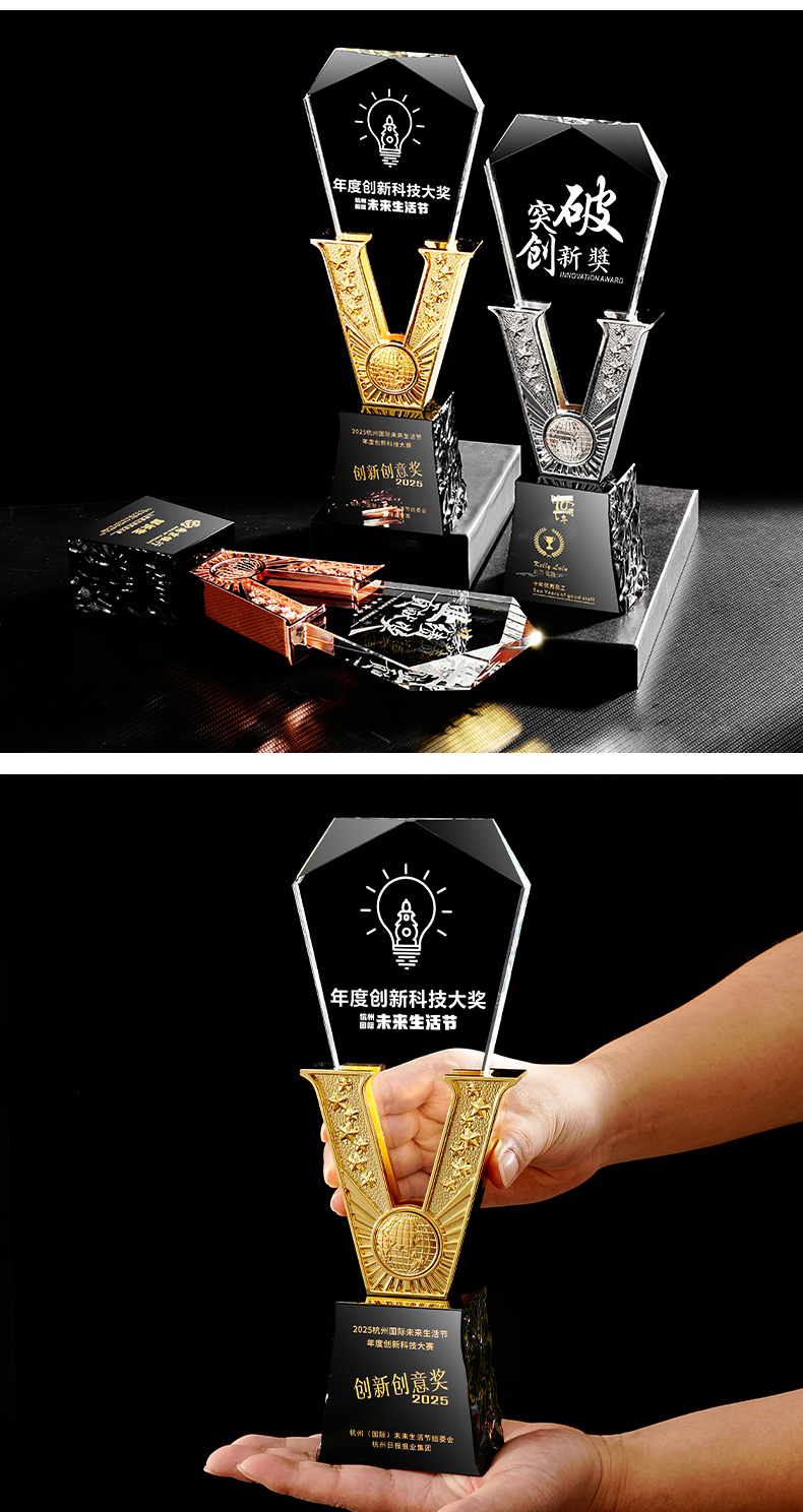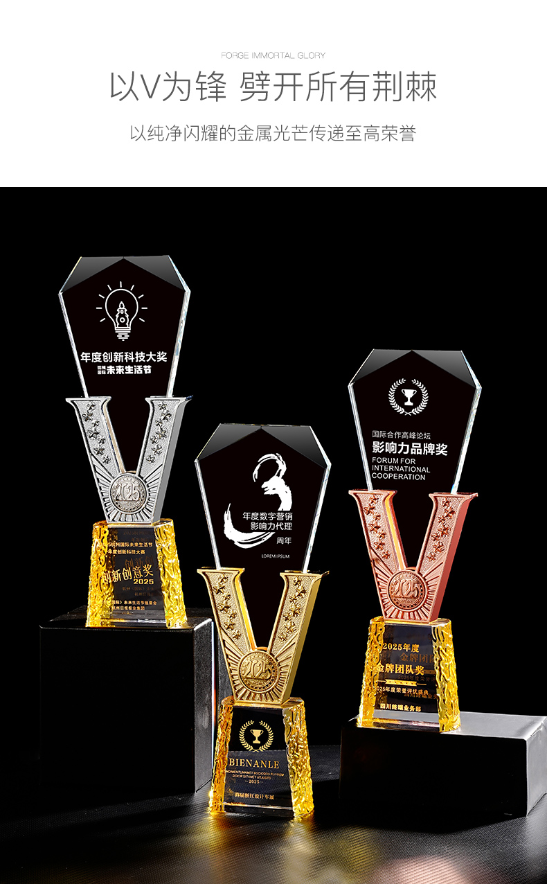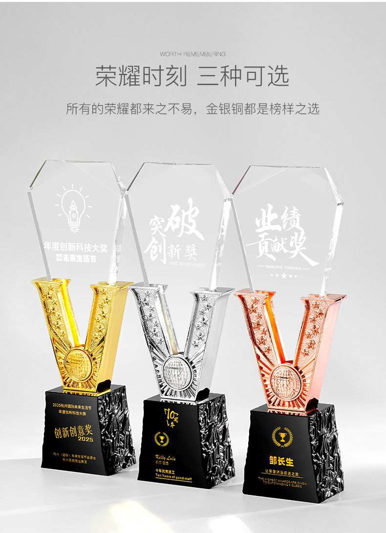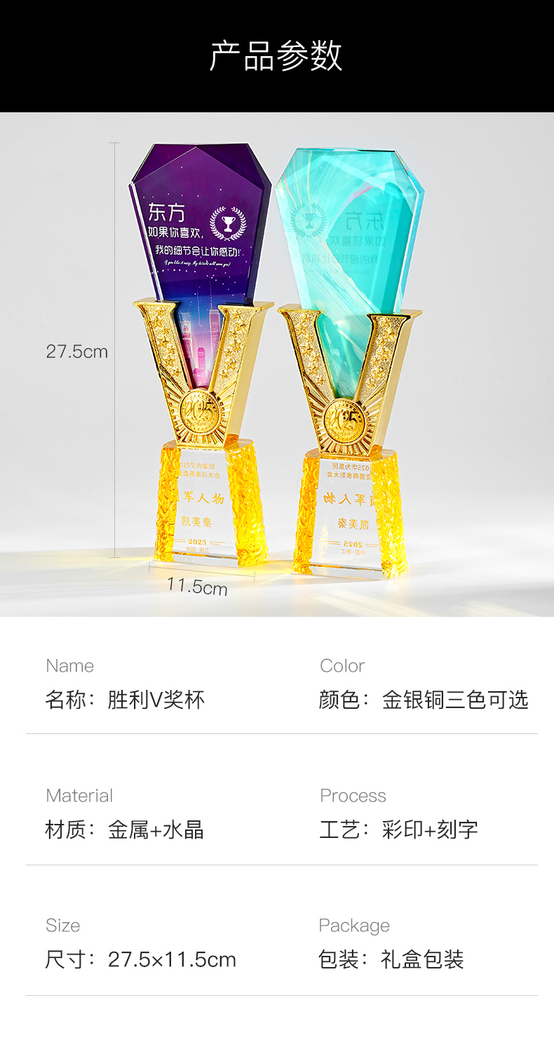 385 / 高端金属V形水晶奖杯定制公司优秀员工年会颁奖纪念创意荣誉奖牌