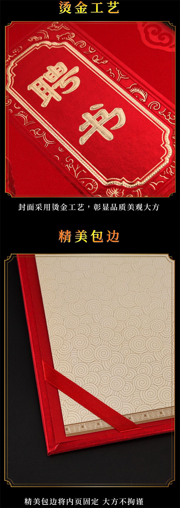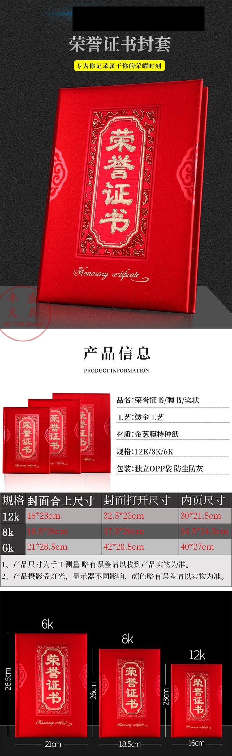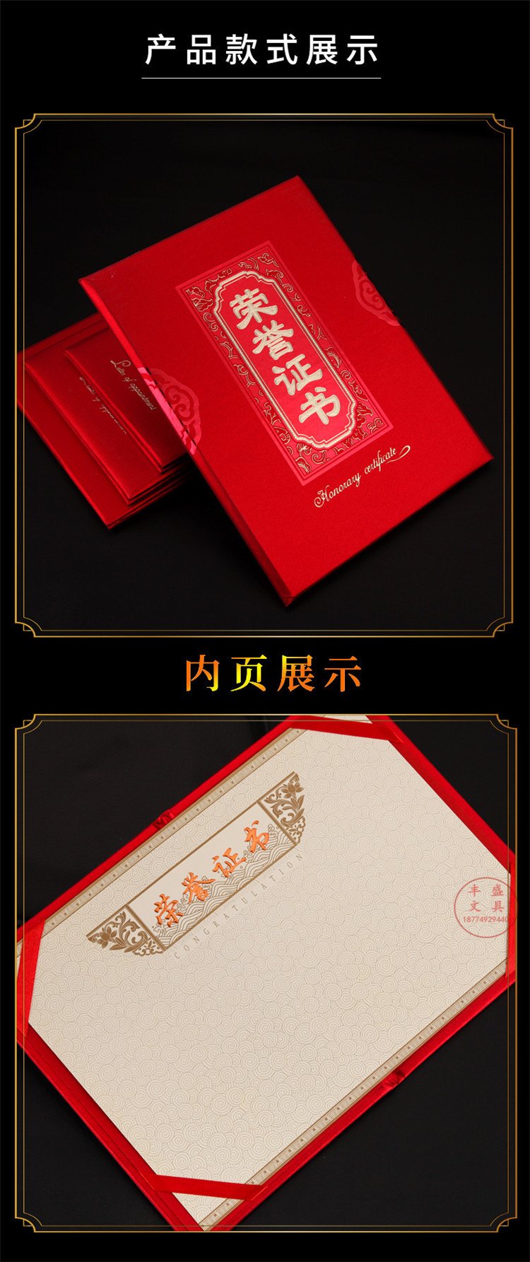 1061 / 荣誉证书金葱磨砂硬本烫金红色面12K/8K/6K皮革获奖颁奖证书竖字