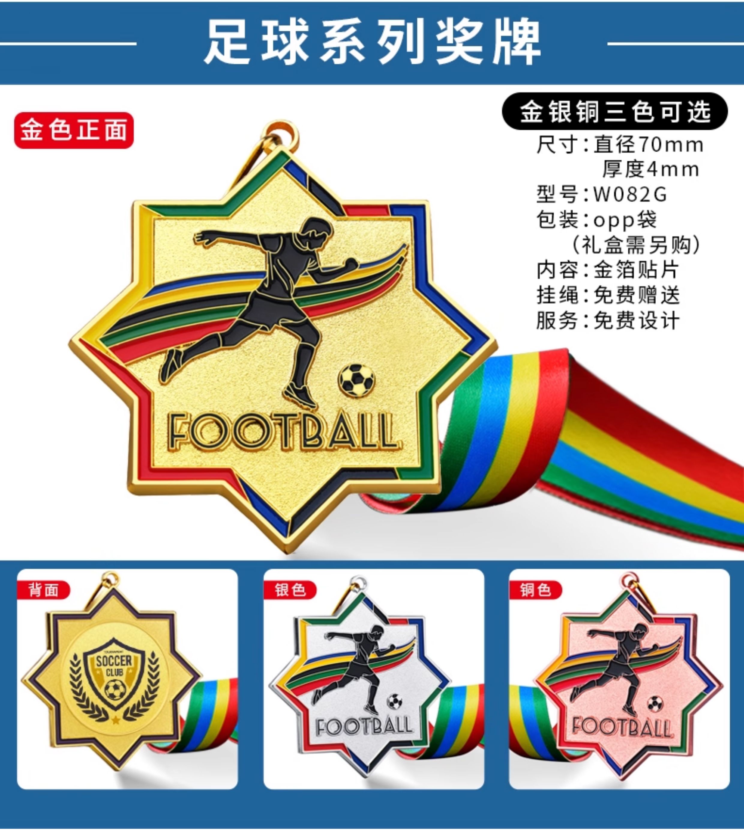 875 / 足球奖杯奖牌定制金属运动比赛挂牌定做创意儿童奖章金银铜纪念牌