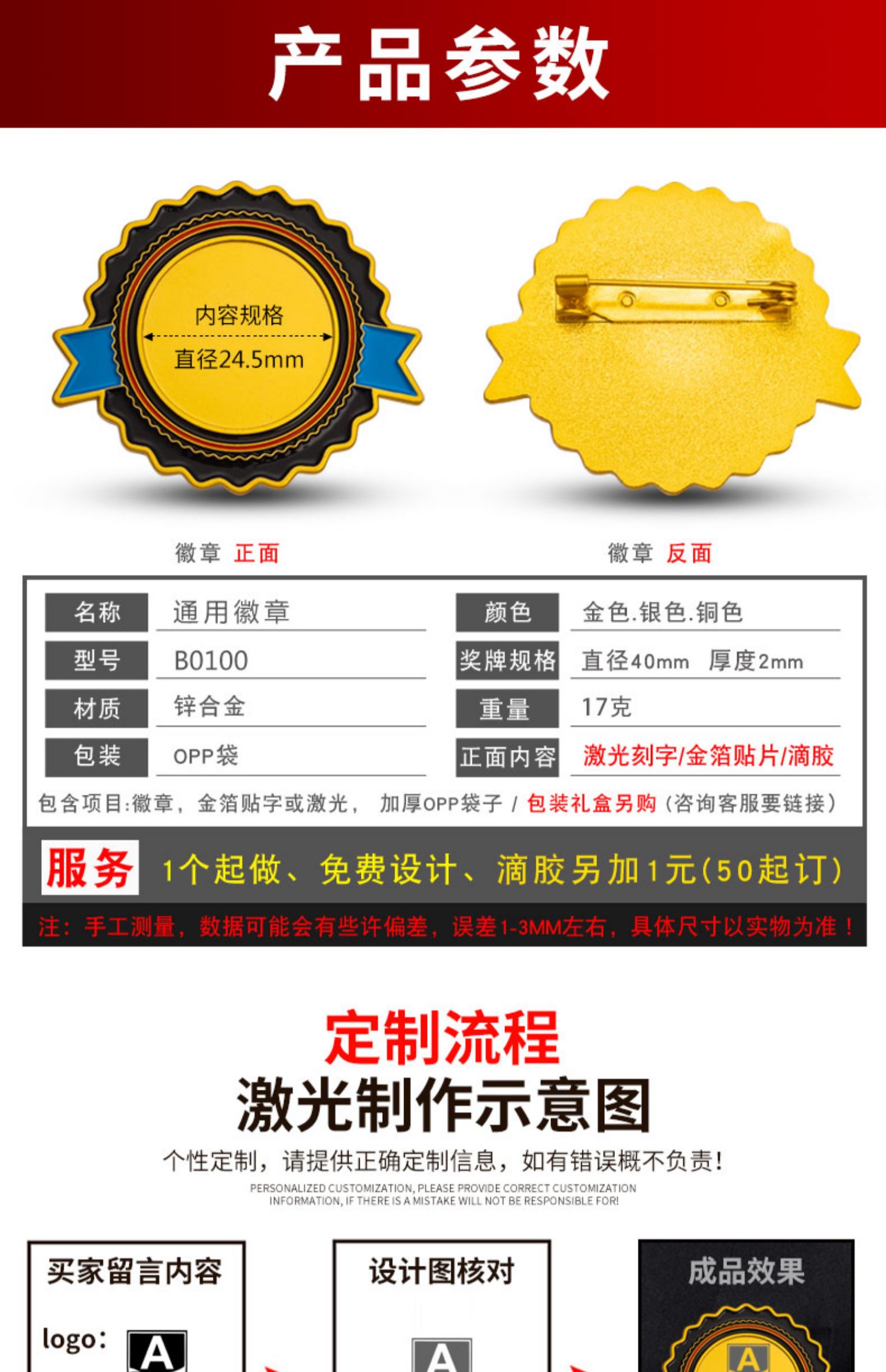 724 / 定制徽章公司别针胸章定做logo儿童奖励勋章校徽班徽金属奖章